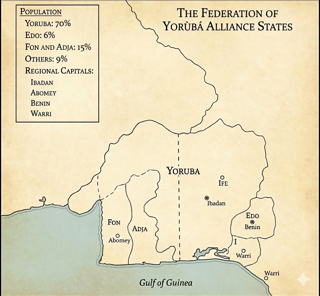 Through a treaty or charter, a number of Yorùbá Kingdoms and City States may have consented to join a single nation state. They may also be willing to unite with the Benin Kingdom and the Dahomey Kingdom to create a nation that resembles Switzerland, Belgium, or the United Kingdom.